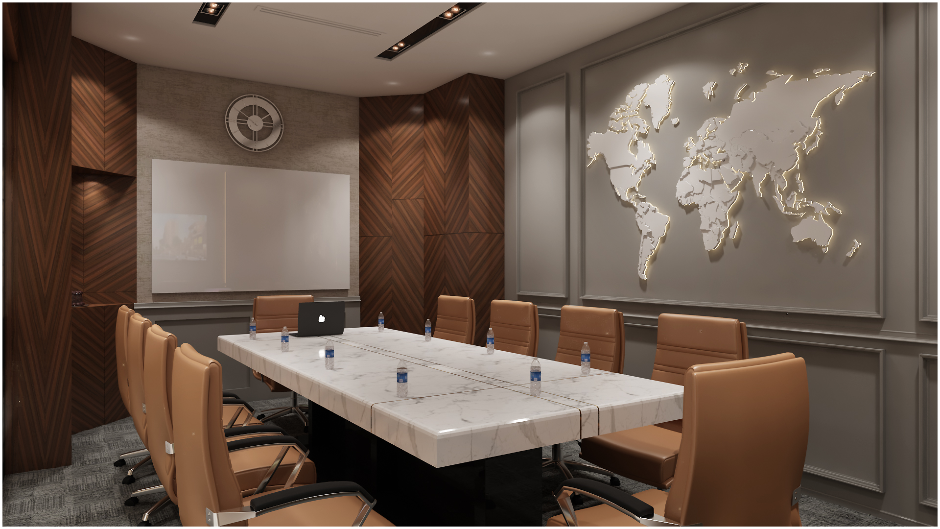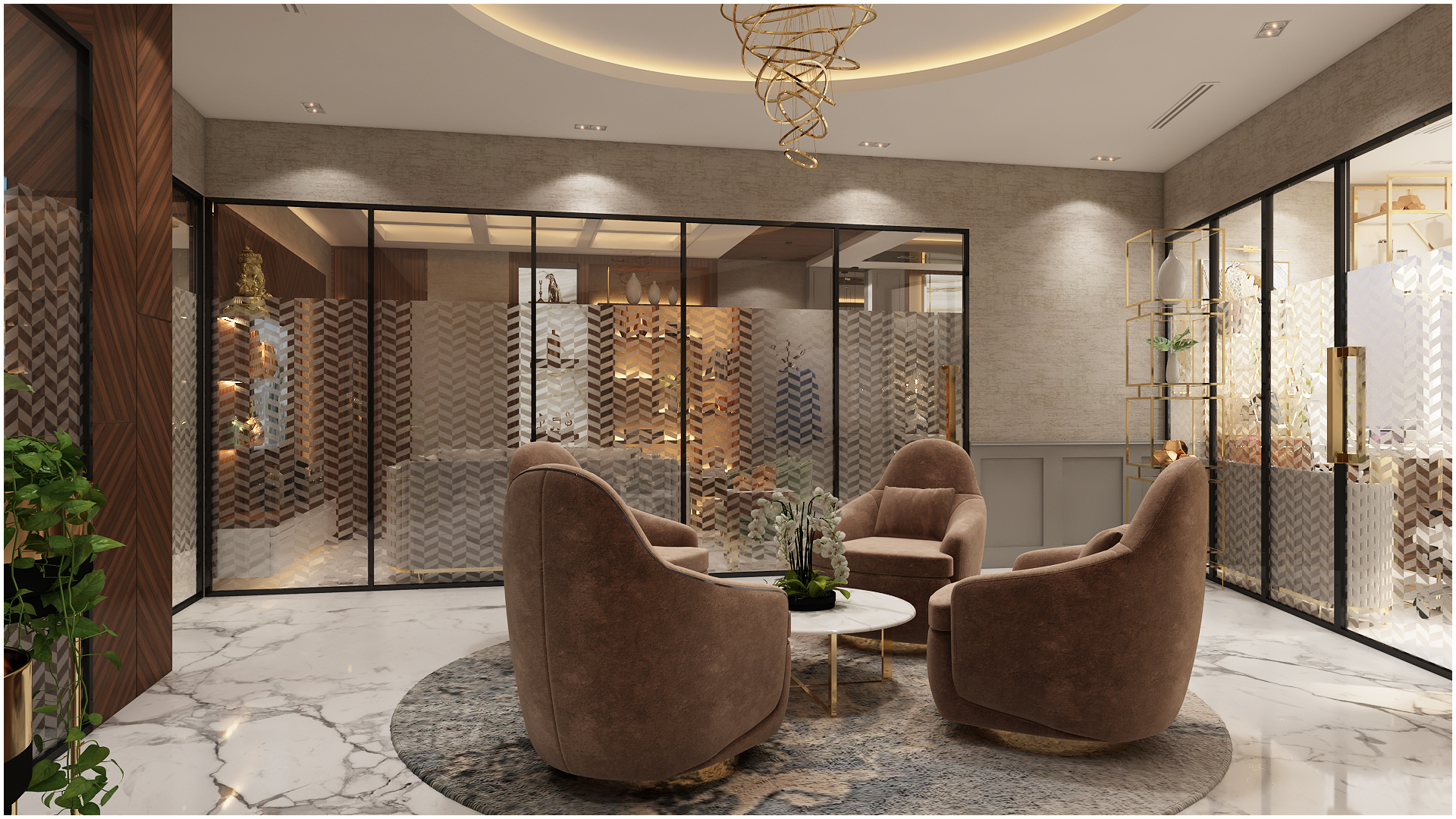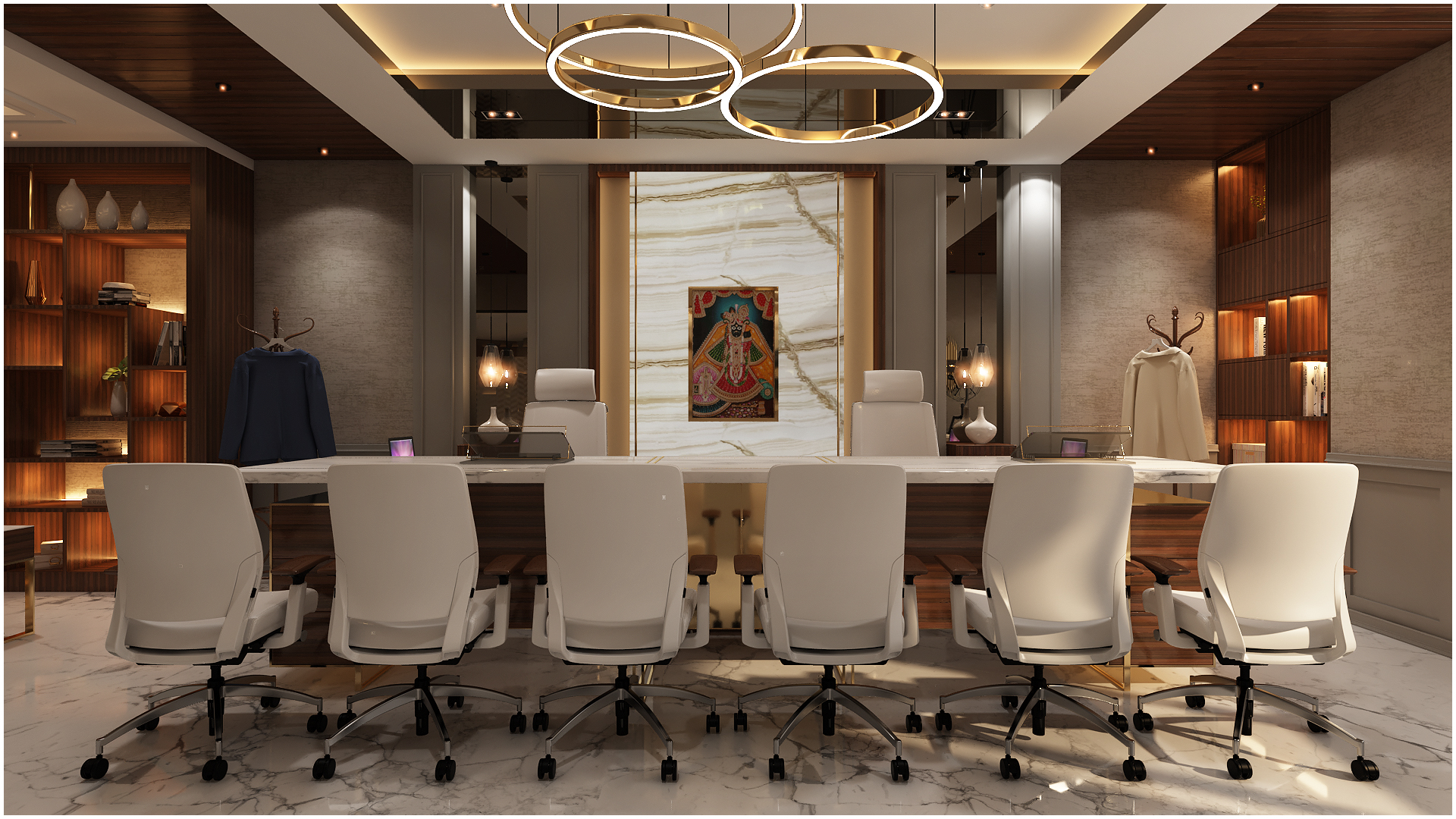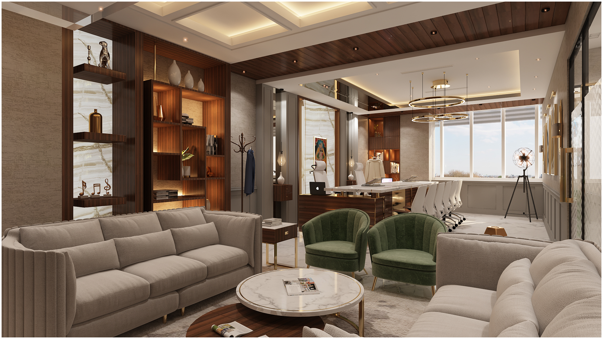 The director’s office is similar in design but with a more modern aesthetic. The desk is made of sleek white marble and is paired with a comfortable high-back chair. Display unit at the back in gold geometrical design is the key element.