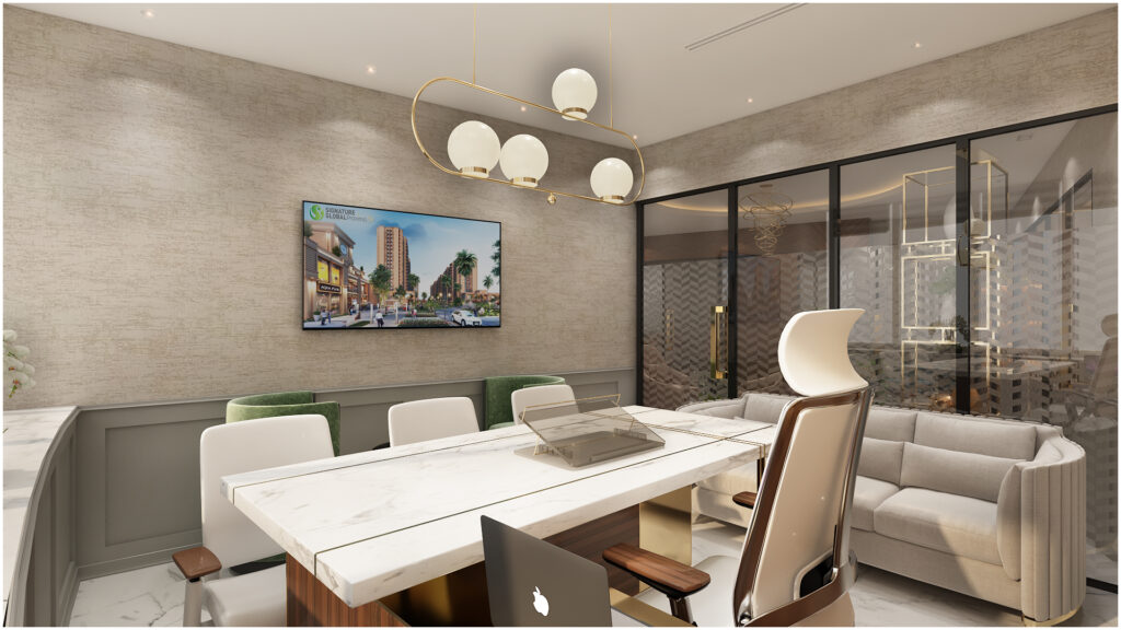 This exquisite office space features a modern and sophisticated design.The chairmen’s office features a large desk made of dark wood with a seamless Satvaria stone top, paired with a comfortable leather executive chair. The walls are painted in a warm neutral tone, with elegant artwork and a large window that allows natural light to flood the space. The room is completed with a comfortable seating area for guests for impromptu meetings or just a casual conversation.