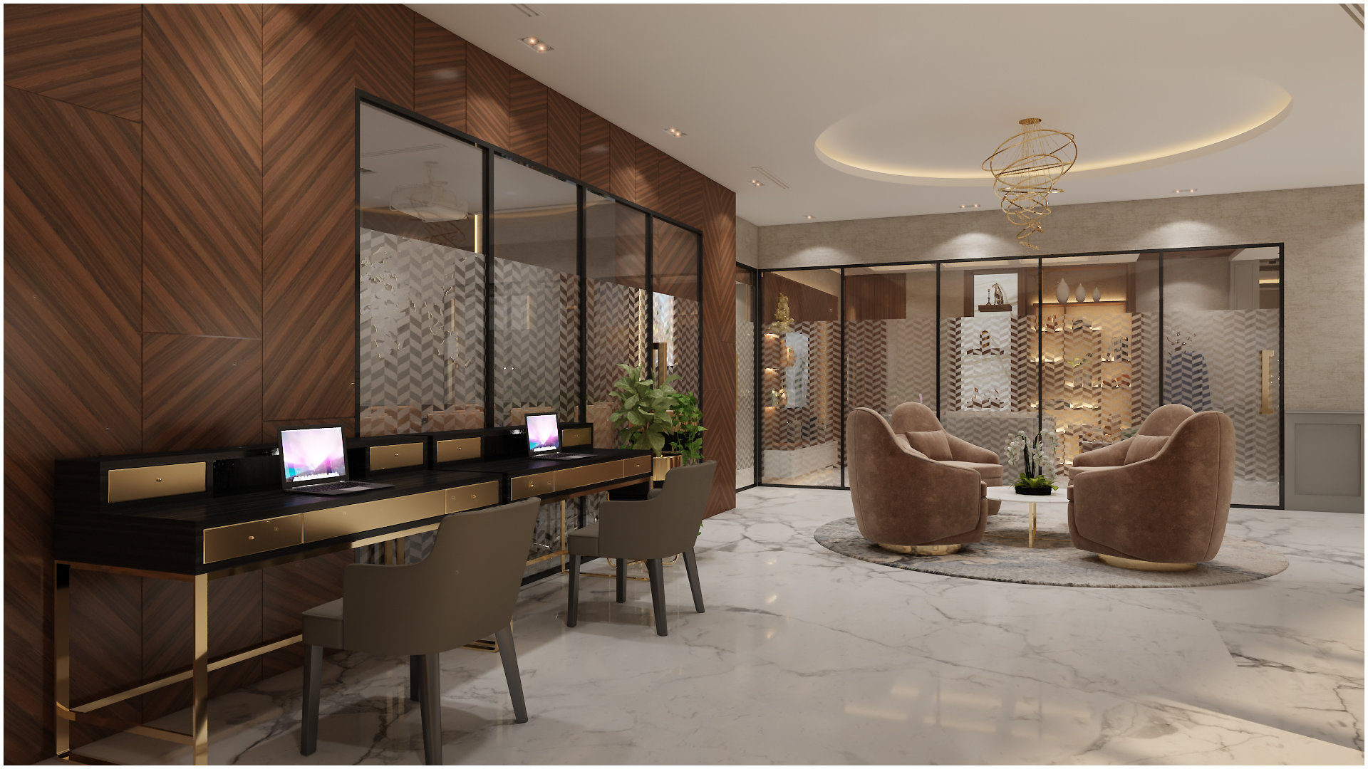 Overall, the office space is designed to exude luxury and sophistication while also being warm and welcoming. The use of warm shades, gold accents, and high-quality materials creates an elegant and impressive atmosphere that is sure to impress clients and visitors.